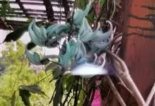 翡翠葛是豆科翡翠葛属植物,多年生常绿大型藤本,茎木质,直径可达30厘米,长可达21.3米。三出复叶,革质光亮,小叶长椭圆形,长7.6-12.7厘米,中间小叶最长。花两性,春季至初夏开花,蓝绿色,…全部>>