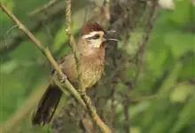 白颊噪鹛是雀形目噪鹛科噪鹛属鸟类,又称土画眉、小画眉、小噪鹃。成鸟额至头顶栗褐色,长眉纹、眼先和颊纹棕白色,眼后至耳羽深褐色,…全部>>