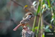 棕头雀鹛为鸦雀科,褐鹛属小型鸟类,体长10-13厘米。头顶栗褐色具黑色侧冠纹。上体茶黄色,飞羽外侧表面灰白色,内侧表面红棕色,内外二色之间夹有黑色。颏、喉白色具不明显的暗色纵纹,胸沾葡萄灰色,…全部>>