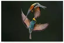 栗喉蜂虎是蜂虎科蜂虎属的鸟类。有热带鸟类羽毛艳丽的特征:喉部是栗红色的,黑色的过眼纹,翅膀和背部是绿色的,尾翼是蓝色的,飞行时翅膀下面的羽毛是橙黄色的,在阳光的照射下,它们全身闪烁着金属般的艳丽光泽,…全部>>