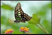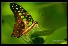 青带凤蝶Graphium sarpedon ,又名青凤蝶,是最普遍的中型凤蝶,飞行速度很快。青带凤蝶的翅膀中央有许多浅蓝色的斑点,很整齐地排列成一条直线。这些斑点由上而下逐渐变大,就像一条青色的带子。全部>>