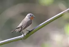 红喉姬鹟小型鸟类,体长11~13厘米。雄鸟上体灰黄褐色,眼先、眼周白色,尾上覆羽和中央尾羽黑褐色,外侧尾羽褐色,基部白色。颏、喉繁殖期间橙红色,胸淡灰色,其余下体白色,非繁殖期颏、喉变为白色。…全部>>