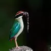 绿胸八色鸫:是雀形目八色鸫科的鸟类,共有12个亚种。体长为16-18厘米,体重65-69克。体型圆胖,尾短,腿长。头黑,上体绿色,两翼深色而具白色斑纹,头顶至后枕深褐,胸及腹部苹果绿,臀亮红。…全部>>