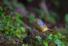 黄喉雀鹛是雀眉科、拟希鹛属小型鸟类,体长11-12厘米。头顶浅黄色具黑色鳞状斑,头顶两侧各有一道黑色侧冠纹,眉纹浅黄色、长而宽阔。上体灰绿色,两翅和尾褐色而具浅黄色窄缘。下体淡黄色。特征明显,…全部>>