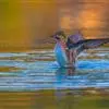 绿翅鸭是小型鸭类,体长37厘米,体重约0.5千克。嘴脚均为黑色。雄鸟头至颈部深栗色,头顶两侧从眼开始有一条宽阔的绿色带斑一直延伸至颈侧,尾下覆羽黑色,两侧各有一黄色三角形斑,在水中游泳时,极为醒目。…全部>>