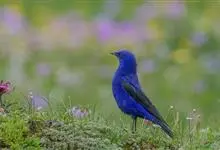 蓝大翅鸲是鹟科、大翅鸲属小型鸟类,体长19-21厘米。两翅尖长。雄鸟通体鲜紫蓝色具金属光泽。两翅和尾黑色。雌鸟上体灰褐色,头、颈、翕具棕白色纵纹,翅上有白色翅斑。虹膜暗褐色,嘴、脚黑色。…全部>>
