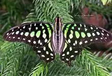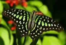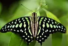 青带凤蝶Graphium sarpedon ,又名青凤蝶,是最普遍的中型凤蝶,飞行速度很快。青带凤蝶的翅膀中央有许多浅蓝色的斑点,很整齐地排列成一条直线。这些斑点由上而下逐渐变大,就像一条青色的带子。全部>>