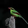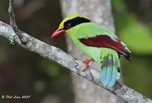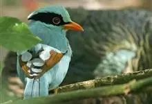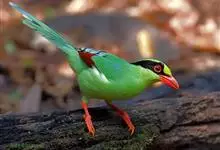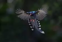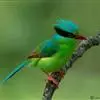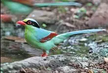 蓝绿鹊:中型鸟类,共有5个亚种。体长36-38厘米。尾长,嘴、脚红色。通体羽色主要为草绿色,宽阔的黑色贯眼纹向后延伸到后颈,在绿色的头侧极为醒目。两翅栗红色,内侧飞羽具黑色次端斑和白色尖端。尾绿色,…全部>>