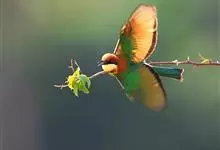 栗喉蜂虎是蜂虎科蜂虎属的鸟类。有热带鸟类羽毛艳丽的特征:喉部是栗红色的,黑色的过眼纹,翅膀和背部是绿色的,尾翼是蓝色的,飞行时翅膀下面的羽毛是橙黄色的,在阳光的照射下,它们全身闪烁着金属般的艳丽光泽,…全部>>