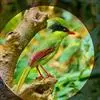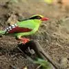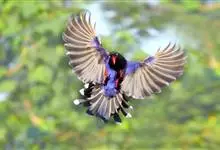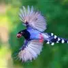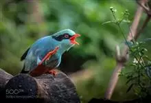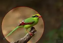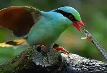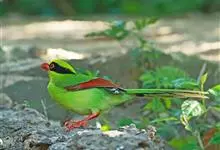 蓝绿鹊:中型鸟类,共有5个亚种。体长36-38厘米。尾长,嘴、脚红色。通体羽色主要为草绿色,宽阔的黑色贯眼纹向后延伸到后颈,在绿色的头侧极为醒目。两翅栗红色,内侧飞羽具黑色次端斑和白色尖端。尾绿色,…全部>>