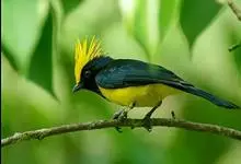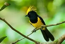 冕雀:共有4个亚种。体长20-21厘米,体重34-49克。具蓬松的黄色长型冠羽。雌鸟似雄鸟,但喉及胸深橄榄黄色,上体沾橄榄色。不会被误认的体大的黄色及黑色山雀。混群栖于原始林及次生林的林冠层,…全部>>