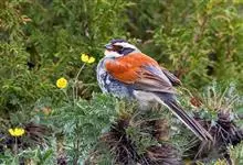 藏鹀:属小型鸣禽。喙为圆锥形,与雀科的鸟类相比较为细弱,上下喙边缘不紧密切合而微向内弯,因而切合线中略有缝隙;体羽似麻雀,此鹀以具有特殊的鲜红栗色背部,及上胸的黑带与下胸的纯灰色等形态特征,…全部>>