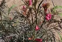角蒿是紫葳科角蒿属的一年生至多年生草本植物。茎分枝,叶互生,回羽状细裂;总状花序顶生,小苞片线形,花萼钟状,萼齿钻状,花冠钟状漏斗形;菊果细圆柱形;种子四周具透明膜质翅;花期5~9月,果期10~11月。…全部>>