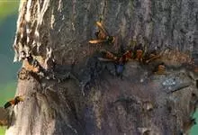 金环胡蜂是胡蜂科、胡蜂属昆虫。雌蜂体长约40毫米,工蜂体长25毫米,雌蜂体黑褐色,头部橙黄色,额片前缘弓形,中央凹,两边突出;触角12节,膝状,暗褐色;中胸背部中央有很细纵沟;翅膜质半透明,…全部>>