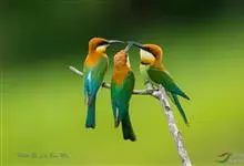 栗喉蜂虎是蜂虎科蜂虎属的鸟类。有热带鸟类羽毛艳丽的特征:喉部是栗红色的,黑色的过眼纹,翅膀和背部是绿色的,尾翼是蓝色的,飞行时翅膀下面的羽毛是橙黄色的,在阳光的照射下,它们全身闪烁着金属般的艳丽光泽,…全部>>