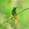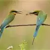 蓝喉蜂是蜂虎科蜂虎属鸟类。体长26-28厘米,嘴长而弯曲,有明显细长的中央尾羽。头部、颈部和背部为巧克力色,有黑色眼纹。喉部、腰部和尾羽为蓝色。腹部和两翼为绿色。幼鸟外观似成鸟,头部、颈部和背部为绿色,…全部>>