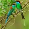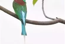 蓝喉蜂是蜂虎科蜂虎属鸟类。体长26-28厘米,嘴长而弯曲,有明显细长的中央尾羽。头部、颈部和背部为巧克力色,有黑色眼纹。喉部、腰部和尾羽为蓝色。腹部和两翼为绿色。幼鸟外观似成鸟,头部、颈部和背部为绿色,…全部>>