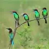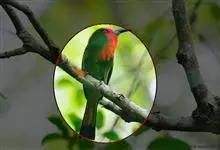 蓝喉蜂是蜂虎科蜂虎属鸟类。体长26-28厘米,嘴长而弯曲,有明显细长的中央尾羽。头部、颈部和背部为巧克力色,有黑色眼纹。喉部、腰部和尾羽为蓝色。腹部和两翼为绿色。幼鸟外观似成鸟,头部、颈部和背部为绿色,…全部>>