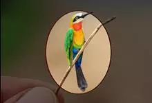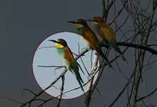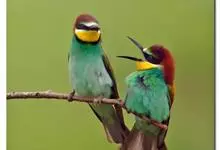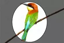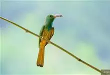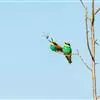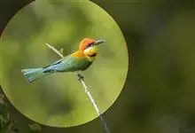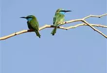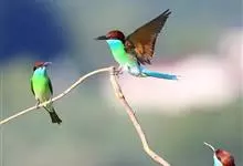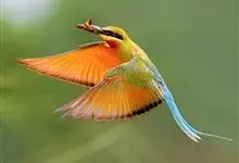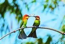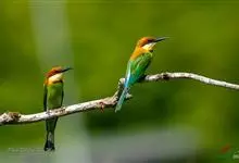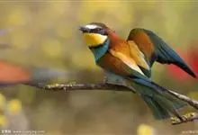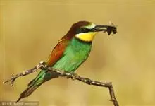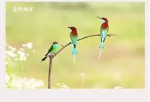 栗喉蜂虎是蜂虎科蜂虎属的鸟类。有热带鸟类羽毛艳丽的特征:喉部是栗红色的,黑色的过眼纹,翅膀和背部是绿色的,尾翼是蓝色的,飞行时翅膀下面的羽毛是橙黄色的,在阳光的照射下,它们全身闪烁着金属般的艳丽光泽,…全部>>