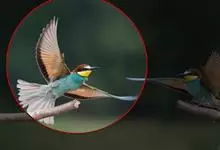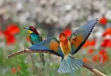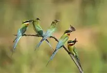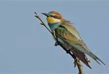 栗喉蜂虎是蜂虎科蜂虎属的鸟类。有热带鸟类羽毛艳丽的特征:喉部是栗红色的,黑色的过眼纹,翅膀和背部是绿色的,尾翼是蓝色的,飞行时翅膀下面的羽毛是橙黄色的,在阳光的照射下,它们全身闪烁着金属般的艳丽光泽,…全部>>