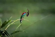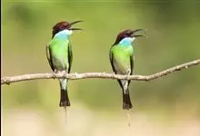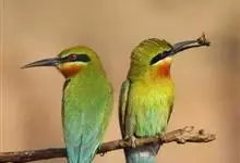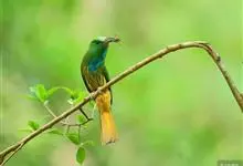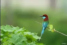 蓝喉蜂是蜂虎科蜂虎属鸟类。体长26-28厘米,嘴长而弯曲,有明显细长的中央尾羽。头部、颈部和背部为巧克力色,有黑色眼纹。喉部、腰部和尾羽为蓝色。腹部和两翼为绿色。幼鸟外观似成鸟,头部、颈部和背部为绿色,…全部>>