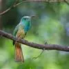 蓝须夜蜂虎是佛法僧目、蜂虎科的鸟类,体长约30厘米,是绿色林栖型蜂虎,蓝色的胸羽蓬松,嘴厚重而下弯。成鸟顶冠淡蓝,腹部棕黄带绿色纵纹。尾羽腹面黄褐。亚成鸟全身绿色。喉、胸部中央的羽甚长和亮色;该物种…全部>>