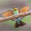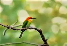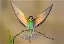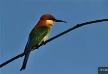 栗喉蜂虎是蜂虎科蜂虎属的鸟类。有热带鸟类羽毛艳丽的特征:喉部是栗红色的,黑色的过眼纹,翅膀和背部是绿色的,尾翼是蓝色的,飞行时翅膀下面的羽毛是橙黄色的,在阳光的照射下,它们全身闪烁着金属般的艳丽光泽,…全部>>