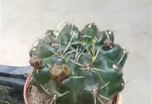 绯花玉 Speg.)是仙人掌科、裸萼球属多肉植物,植株呈扁球形,表皮墨绿色,刺针状,每个刺座有5枚灰色周刺,花生于球体顶端,夏季开花,花色有白、粉红、深红等。果实纺锤形,深灰绿色,种子黑色。…全部>>