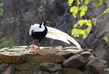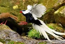 白鹇,是鸡形目雉科鹇属的一种留鸟。雄鸟上体白色并具黑色纹,下体黑色,头顶具黑色长羽冠,尾白而长;雌鸟体型较小,以橄榄褐色为主,下体具白色或皮黄色细纹;虹膜褐色,眼周具红色裸皮,喙黄色,脚鲜红色。…全部>>