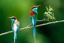 蓝喉蜂是蜂虎科蜂虎属鸟类。体长26-28厘米,嘴长而弯曲,有明显细长的中央尾羽。头部、颈部和背部为巧克力色,有黑色眼纹。喉部、腰部和尾羽为蓝色。腹部和两翼为绿色。幼鸟外观似成鸟,头部、颈部和背部为绿色,…全部>>