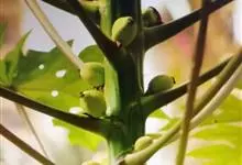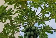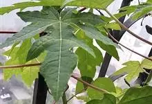 番木瓜,番木瓜科番木瓜属的常绿软木质小乔木,高达10米,具有乳汁;茎不分枝或有时于损伤处分枝;叶大且聚生于茎顶,近似盾形,叶柄中空;花单性或两性,有些品种雄株偶尔生两性花或雌花,…全部>>