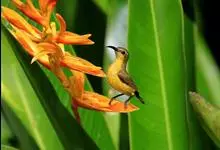 火尾太阳鸟为太阳鸟科太阳鸟属的鸟类。体长20厘米,色彩艳丽。雄鸟红色,具形长的艳猩红色中央尾羽。头顶金属蓝色,眼先和头侧黑色,喉及髭纹金属紫色。下体黄色,胸具艳丽的橘黄色块斑。雌鸟灰橄榄色,腰黄,…全部>>