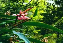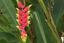金嘴蝎尾蕉:芭蕉科,蝎尾蕉属多年生草本植物。株高可达6米。叶片长圆形,叶面绿色,叶背亮紫色;顶生花序,直立,薄被短柔毛;苞片绿色,开放时突露,花被片红色,顶端绿色,狭圆柱形,果三棱形,灰蓝色,有种子…全部>>