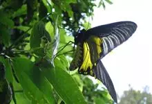 荧光裳凤蝶是凤蝶科裳凤蝶属的一种大型蝴蝶,该物种共有3个亚种。该蝶飞翔的时候姿态优美,前翅黑色,后翅金黄色和黑色交融的斑纹在阳光照射下金光灿灿,显得华贵美丽。幼虫寄主为多种马兜铃属的植物,取食马兜铃…全部>>