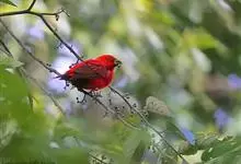 血雀雀科朱雀属鸟类,体重36-49克;体长155-182毫米。雄鸟除眼先、翼与尾为黑色外,通体为鲜红色;嘴鲜黄;雌鸟暗橄榄绿色,羽端较淡或带黄色;腰鲜黄;嘴较暗。虹膜褐色;嘴黄色;腿和脚褐色。…全部>>