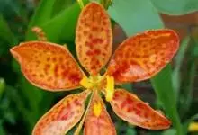 射干 Redouté)是鸢尾科射干属多年生草本植物。根状茎为不规则的块状,斜黄色或黄褐色;花橙红色,散生紫褐色的斑点;花药呈条形;子房下位,倒卵形;蒴果倒卵形或长椭圆形;种子圆球形,黑紫色,有光泽。…全部>>