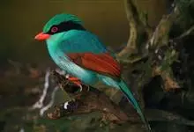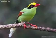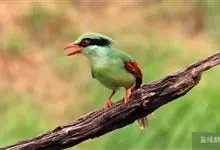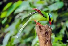蓝绿鹊:中型鸟类,共有5个亚种。体长36-38厘米。尾长,嘴、脚红色。通体羽色主要为草绿色,宽阔的黑色贯眼纹向后延伸到后颈,在绿色的头侧极为醒目。两翅栗红色,内侧飞羽具黑色次端斑和白色尖端。尾绿色,…全部>>