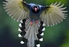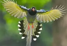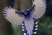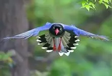 台湾蓝鹊:体长64至65厘米,翼展18至21厘米,尾长约40厘米,尾羽长占了总体长的三分之二。头、脸、颈、喉、胸都是黑色,黄色的眼珠包围黑色的瞳孔,鲜红色的鸟喙、双脚,…全部>>