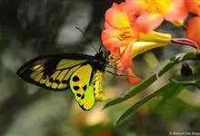 金裳凤蝶是凤蝶科、裳凤蝶属的动物。金裳凤蝶身体呈黑色,头、颈和胸侧有红毛,腹部有黑黄两色相间条纹,雄蝶前翅黑色,具黑天鹅绒光泽,各脉两侧灰白色,后翅金黄色,各室外缘有等腰三角形黑斑1枚,斑内侧有晕,…全部>>