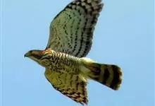 凤头鹰是隼形目鹰科鹰属鸟类。体大,具短羽冠。成年雄鸟上体灰褐;两翼及尾具横斑;下体棕色;胸部具白色纵纹;腹部及大腿白色具近黑色粗横斑;颈白,有近黑色纵纹至喉,具两道黑色髭纹。亚成鸟及雌鸟似成年雄鸟,…全部>>