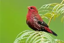 红梅花雀小型鸟类,体长9-10厘米。雄鸟通体朱红色,背、肩、胸等满布白色小斑点,两翅和尾黑褐色均具白色端斑,嘴红色,脚蜡黄色。雌鸟上体淡褐色或赭褐色,翅上中覆羽、大覆羽和内侧飞羽末端具白色斑点,…全部>>