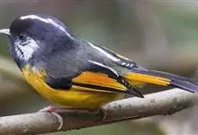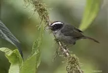 金胸雀鹛是莺科、雀鹛属小型鸟类,体长10-11厘米。头黑色,头顶中央有一道白色中央冠纹,颊和耳羽亦为白色,在黑色的头部极为醒目。上体深灰沾绿。两翅黑色,外侧飞羽有黄色外缘和白色端斑;尾凸状、黑色。…全部>>