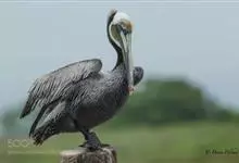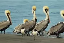 褐鹈鹕:是鹈鹕家族中体型最小的成员。体型粗大,体重6.5-9千克。嘴形宽大直长,上嘴尖端朝下弯曲,呈钩状;下嘴分左右二支,其间有一巨大而能扩缩的皮肤喉囊;鼻孔小,而位于嘴基。眼前部裸出。颈长而较细小…全部>>