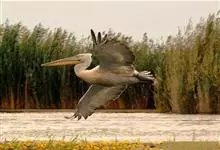 卷羽鹈鹕是一种大型的白色水鸟,体羽灰白,眼浅黄,喉囊桔黄或黄色,颈背具卷曲的冠羽。是生活在沼泽及浅水湖的一种鹈鹕,主要为内陆淡水湿地的鸟,但也出现在海岸潟湖及河口,在小岛的大片芦苇或空旷处营巢繁殖。…全部>>