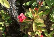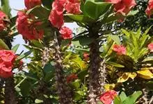虎刺梅:别称铁海棠,是蔓生灌木植物。茎多分枝,长60-100厘米,直径5-10毫米,具纵棱,密生硬而尖的锥状刺,刺长1-1.5厘米,直径0.5-1.0 毫米,常呈3-5列排列于棱脊上,呈旋转。叶互生…全部>>