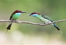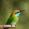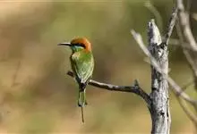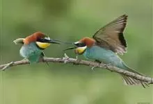 绿喉蜂虎是佛法僧目、蜂虎科的小型鸟类,共有9个亚种。身长22-25厘米,翼展29-30厘米,体重15-20克。喉绿色,额部、头顶至上背为锈红色,其余上体均为亮绿色。中央尾羽延长且端段狭细,…全部>>