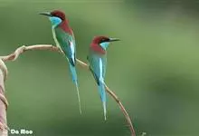 蓝喉蜂是蜂虎科蜂虎属鸟类。体长26-28厘米,嘴长而弯曲,有明显细长的中央尾羽。头部、颈部和背部为巧克力色,有黑色眼纹。喉部、腰部和尾羽为蓝色。腹部和两翼为绿色。幼鸟外观似成鸟,头部、颈部和背部为绿色,…全部>>