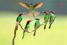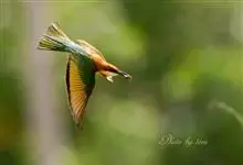 栗喉蜂虎是蜂虎科蜂虎属的鸟类。有热带鸟类羽毛艳丽的特征:喉部是栗红色的,黑色的过眼纹,翅膀和背部是绿色的,尾翼是蓝色的,飞行时翅膀下面的羽毛是橙黄色的,在阳光的照射下,它们全身闪烁着金属般的艳丽光泽,…全部>>