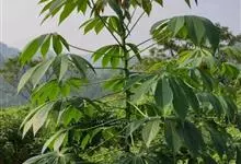 木薯,为大戟科木薯属的一种直立灌木,又名木番薯、树薯。木薯高1.5-3米;块根圆柱状。叶纸质,轮廓近圆形;裂片倒披针形至狭椭圆形;托叶三角状披针形。圆锥花序顶生或腋生,花萼带紫红色且有白粉霜。…全部>>