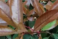 红叶石楠 是蔷薇科,石楠属杂交种,为常绿小乔木或灌木,乔木高可达5米、灌木高可达2米。叶片革质,长圆形至倒卵状、披针形,叶端渐尖,叶基楔形,叶缘有带腺的锯齿,花多而密,复伞房花序,花白色,梨果黄红色,…全部>>